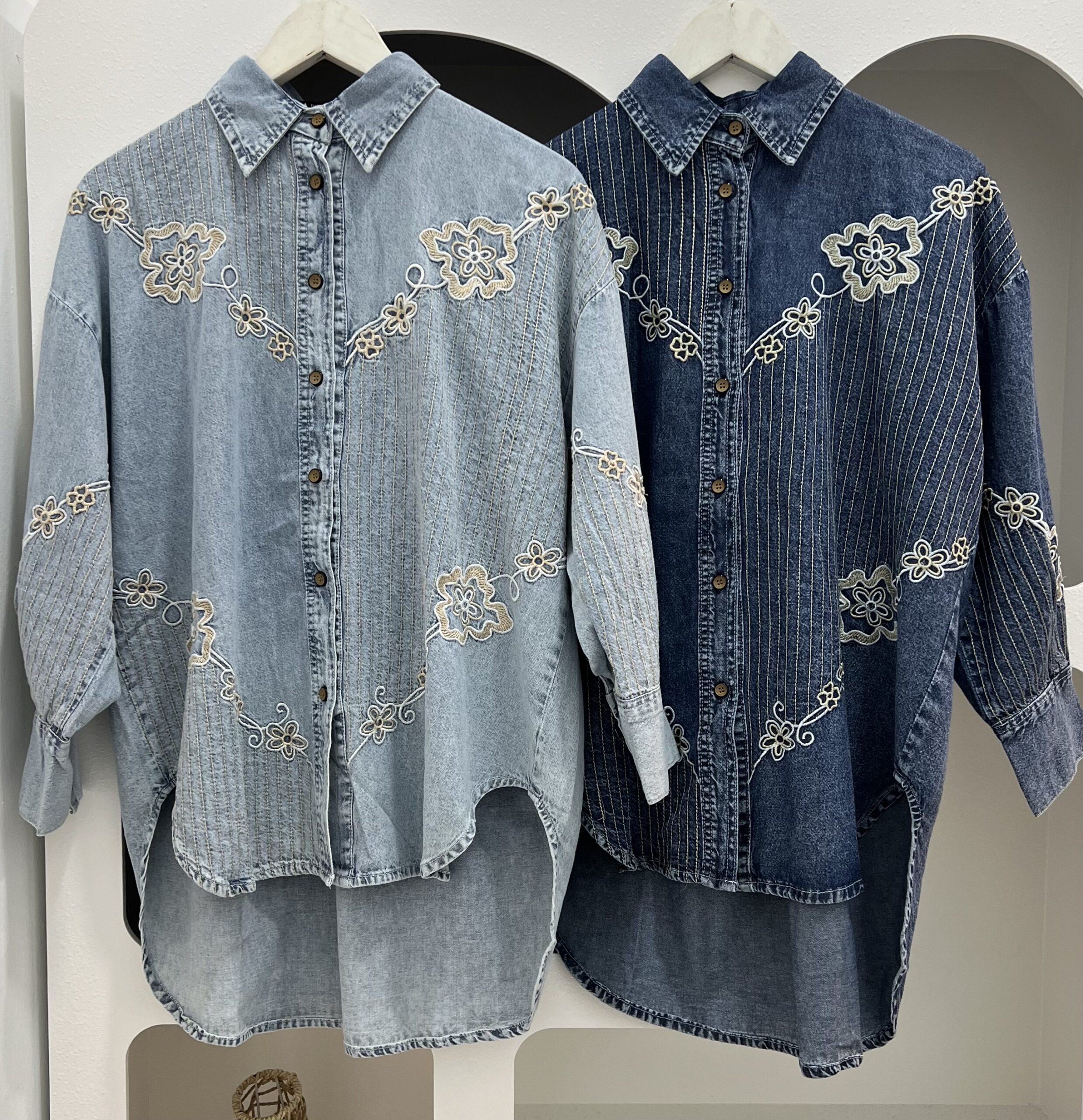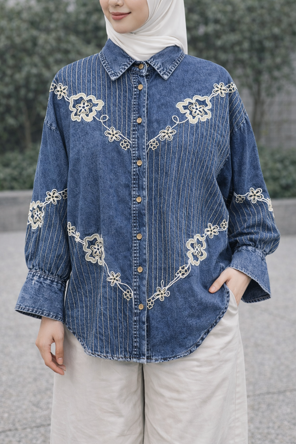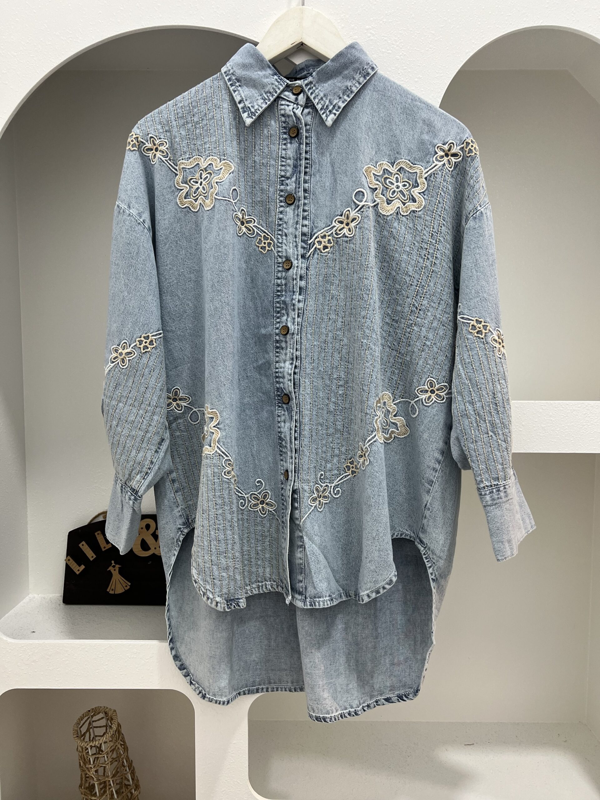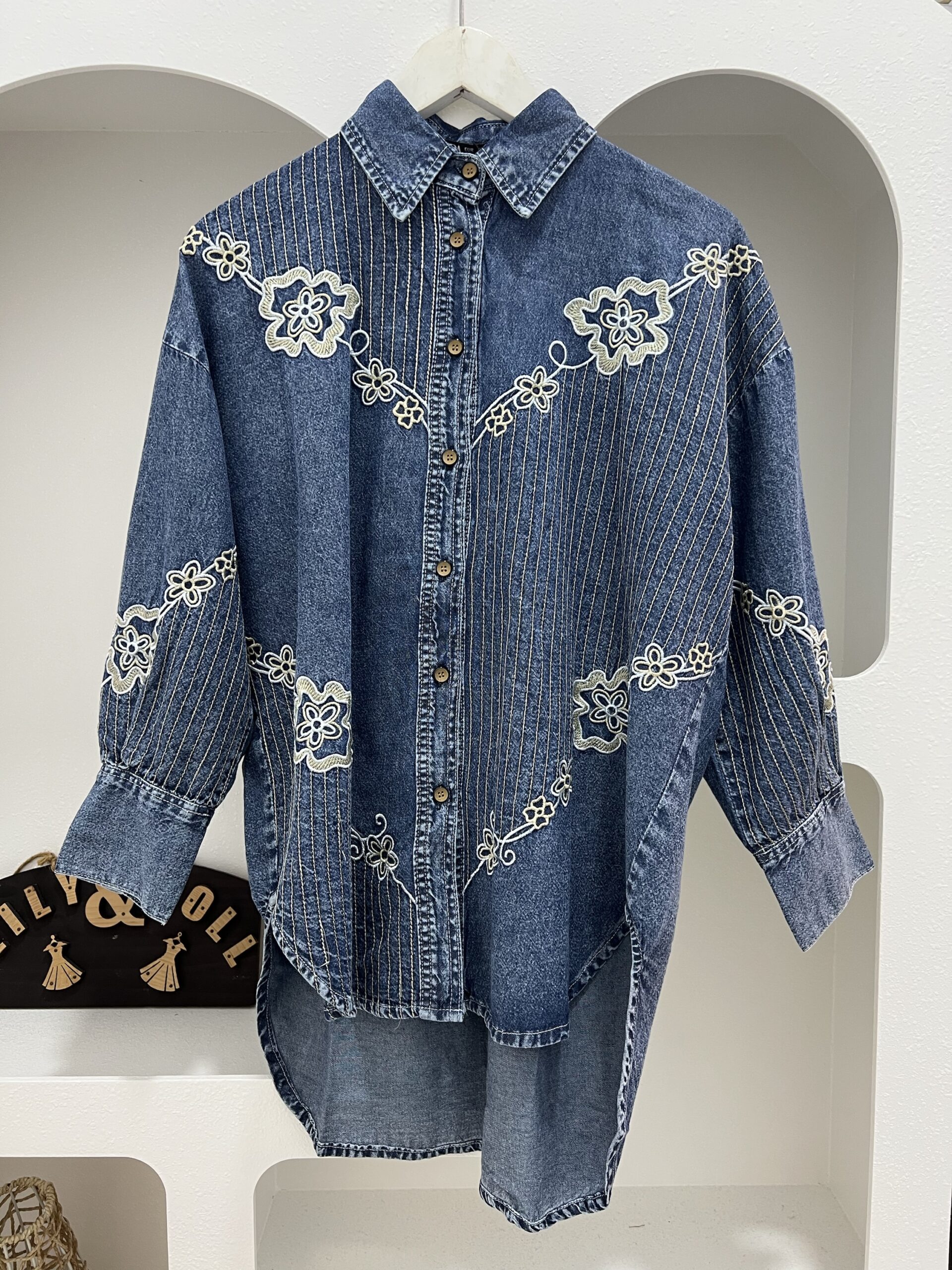 A timeless blouse crafted from soft denim fabric, designed for all-day comfort and effortless style. Featuring delicate floral embroidery that adds a feminine and elegant touch, this blouse comes with a classic collar, front button closure, and long sleeves with subtle gathered cuffs. Easy to style for both casual and semi-dressy looks.