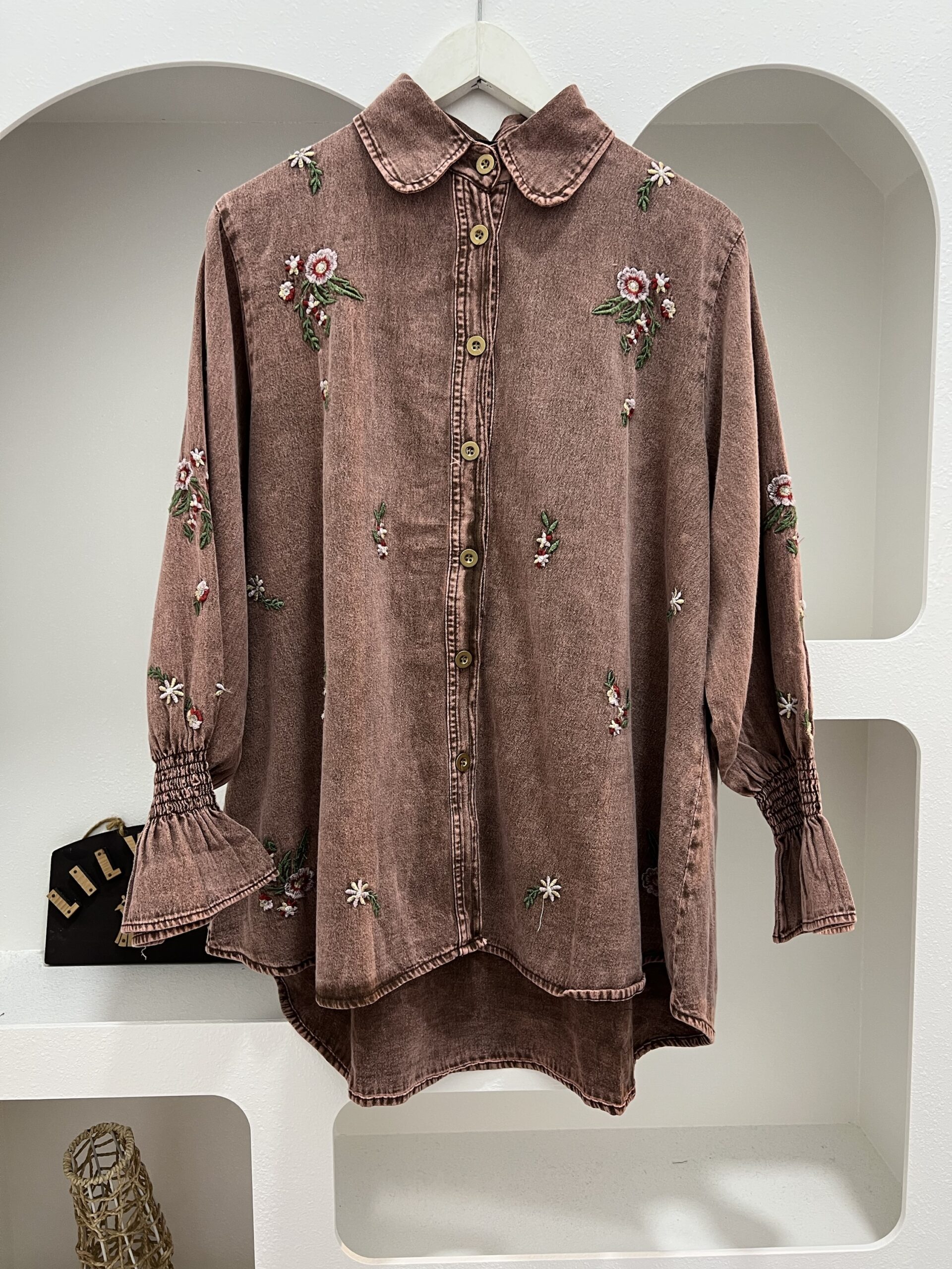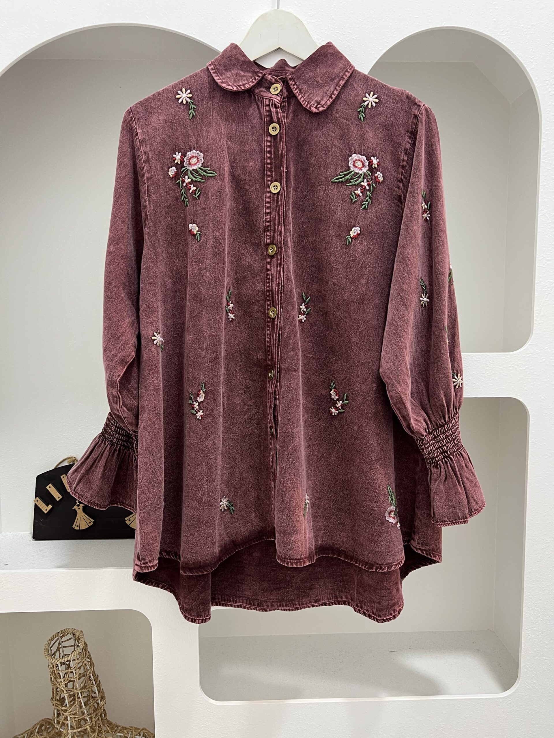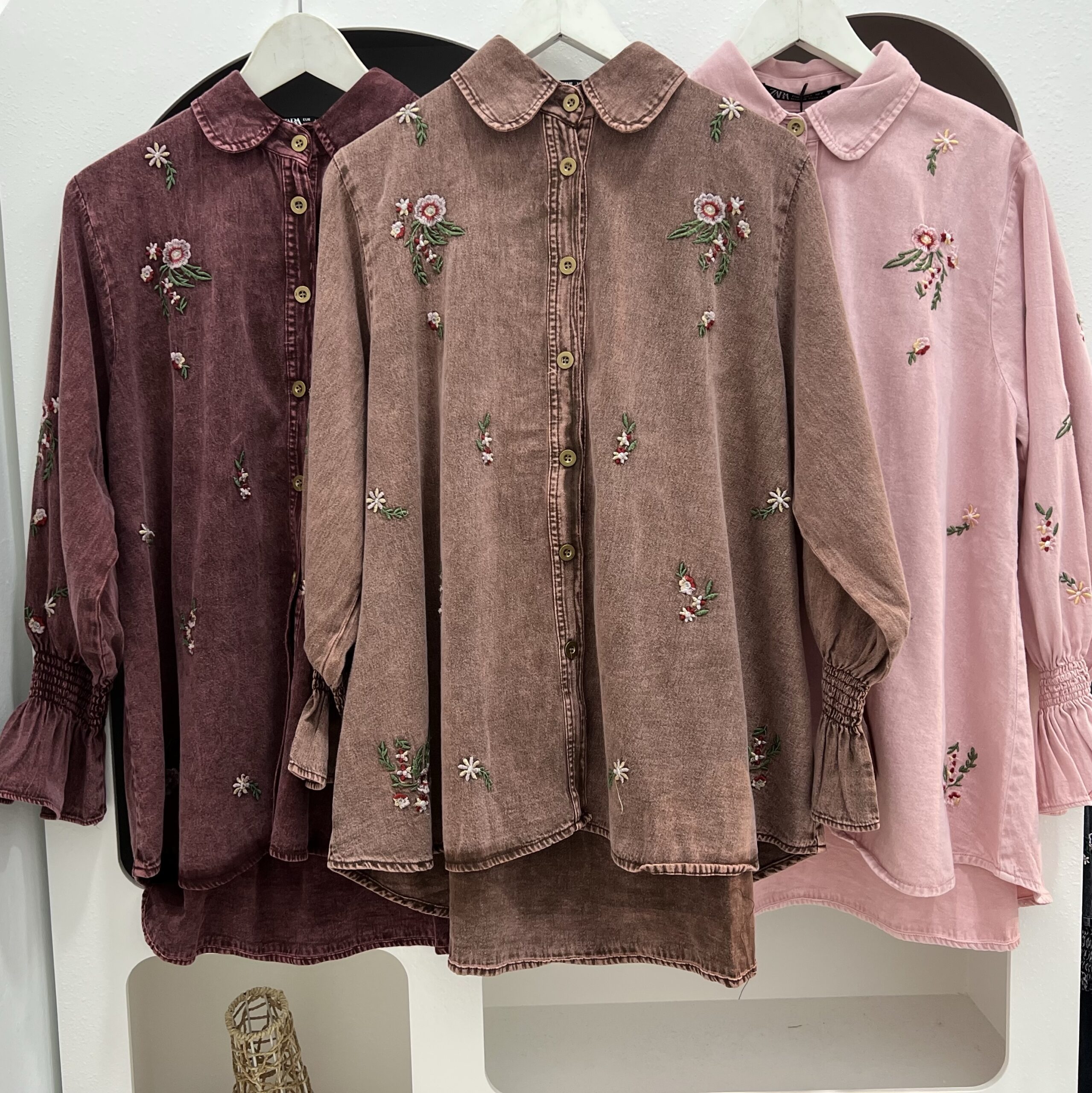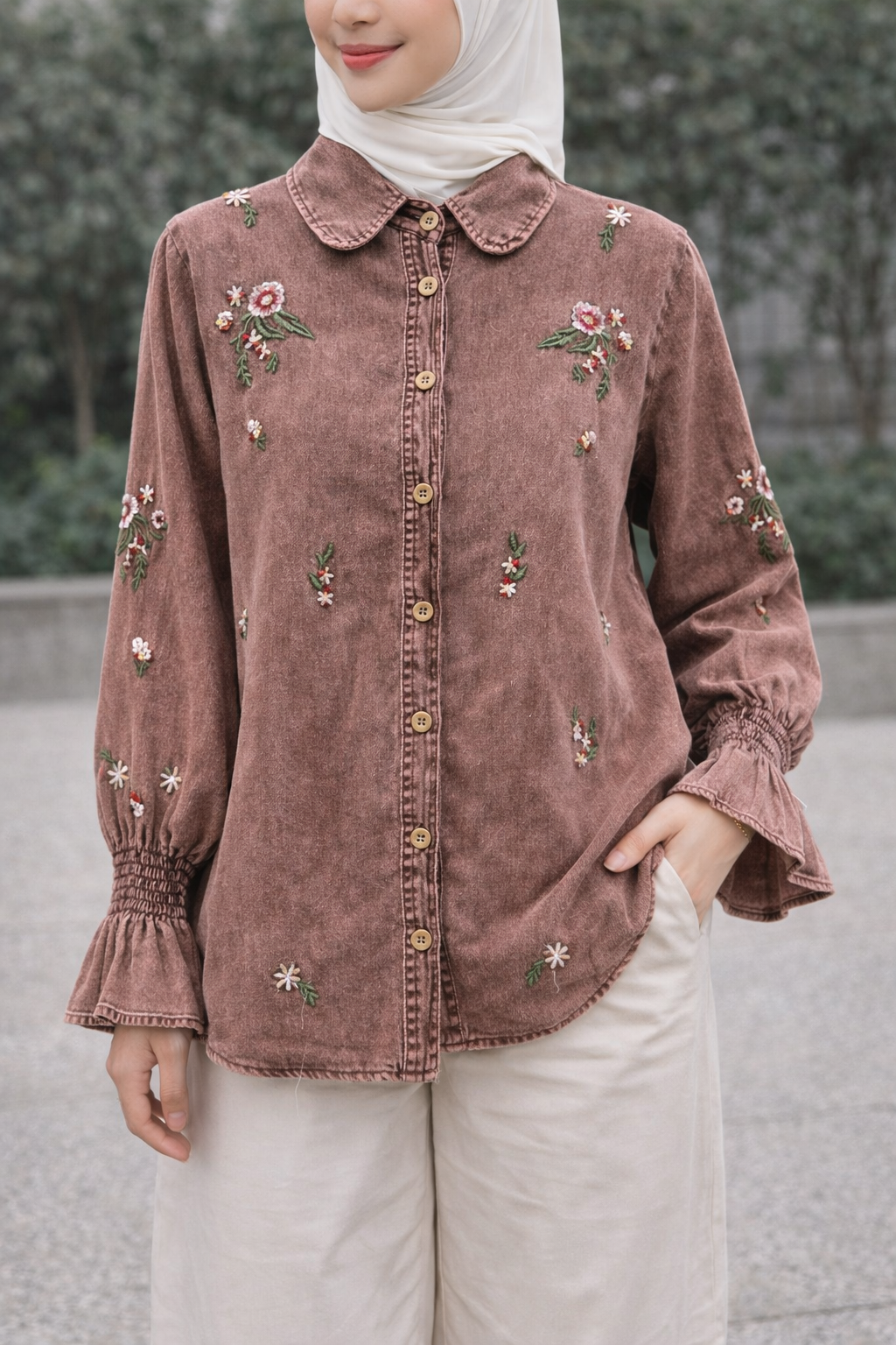 A beautifully crafted denim blouse in a soft tone, adorned with delicate floral embroidery for a timeless, feminine look. Designed with a classic collar, front button closure, and subtle gathered cuffs that add a gentle vintage touch. Made from comfortable denim fabric, perfect for effortless everyday styling or dressed-up casual wear.