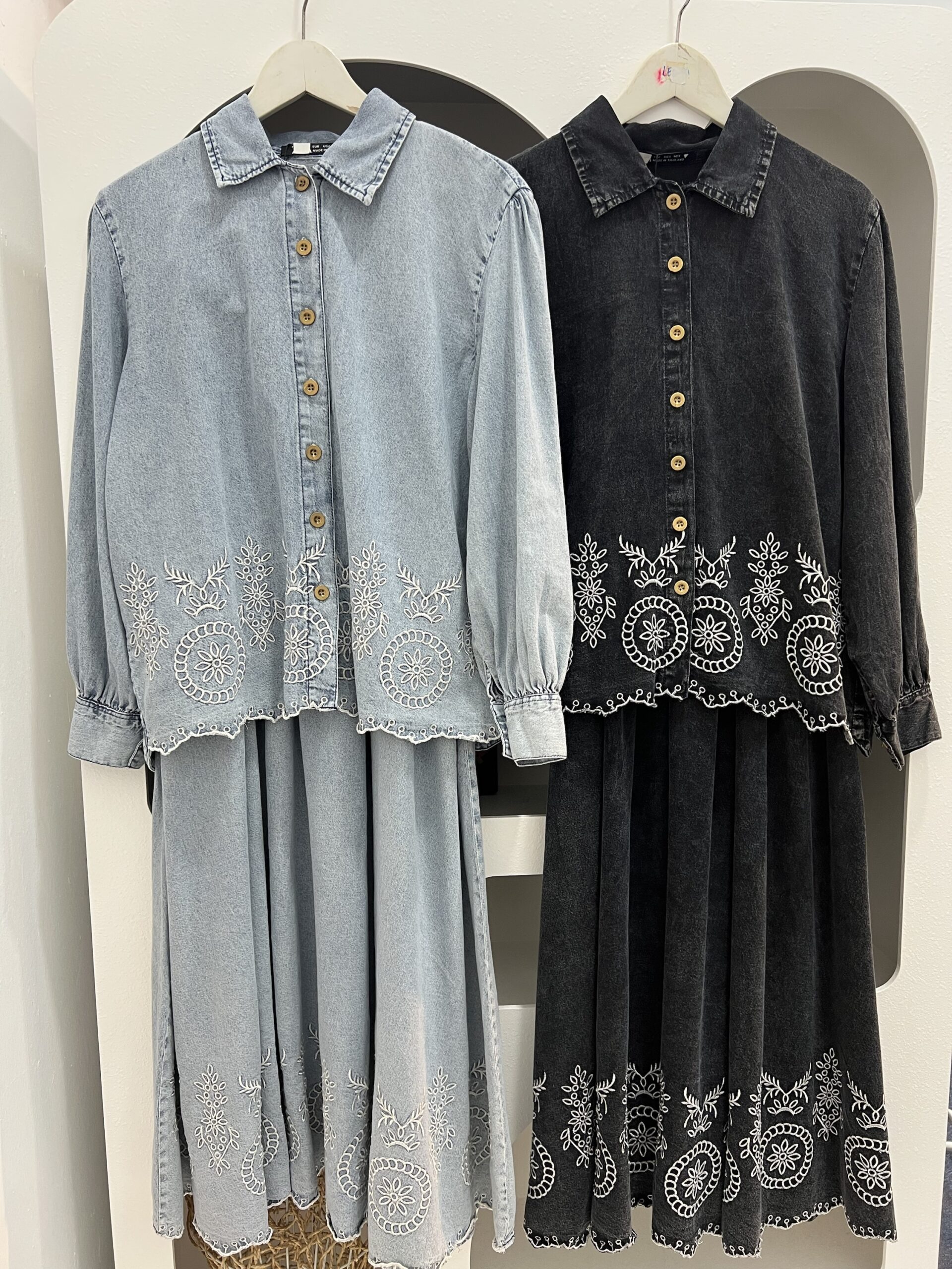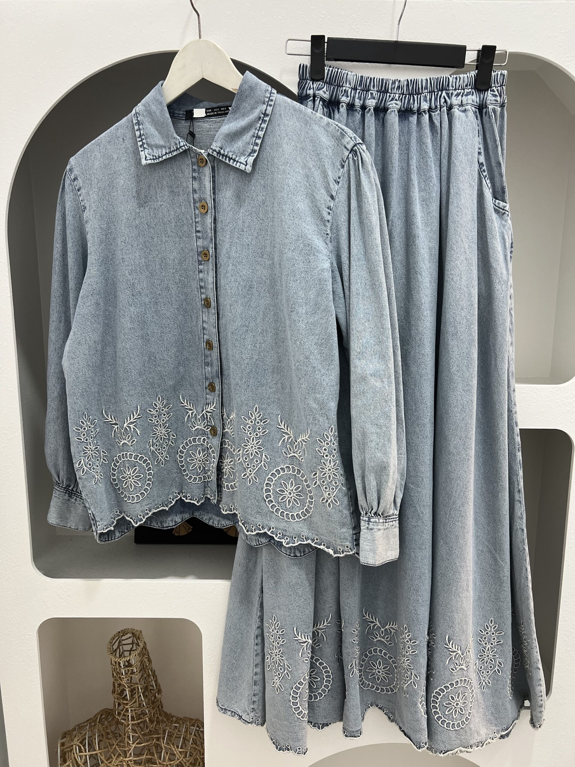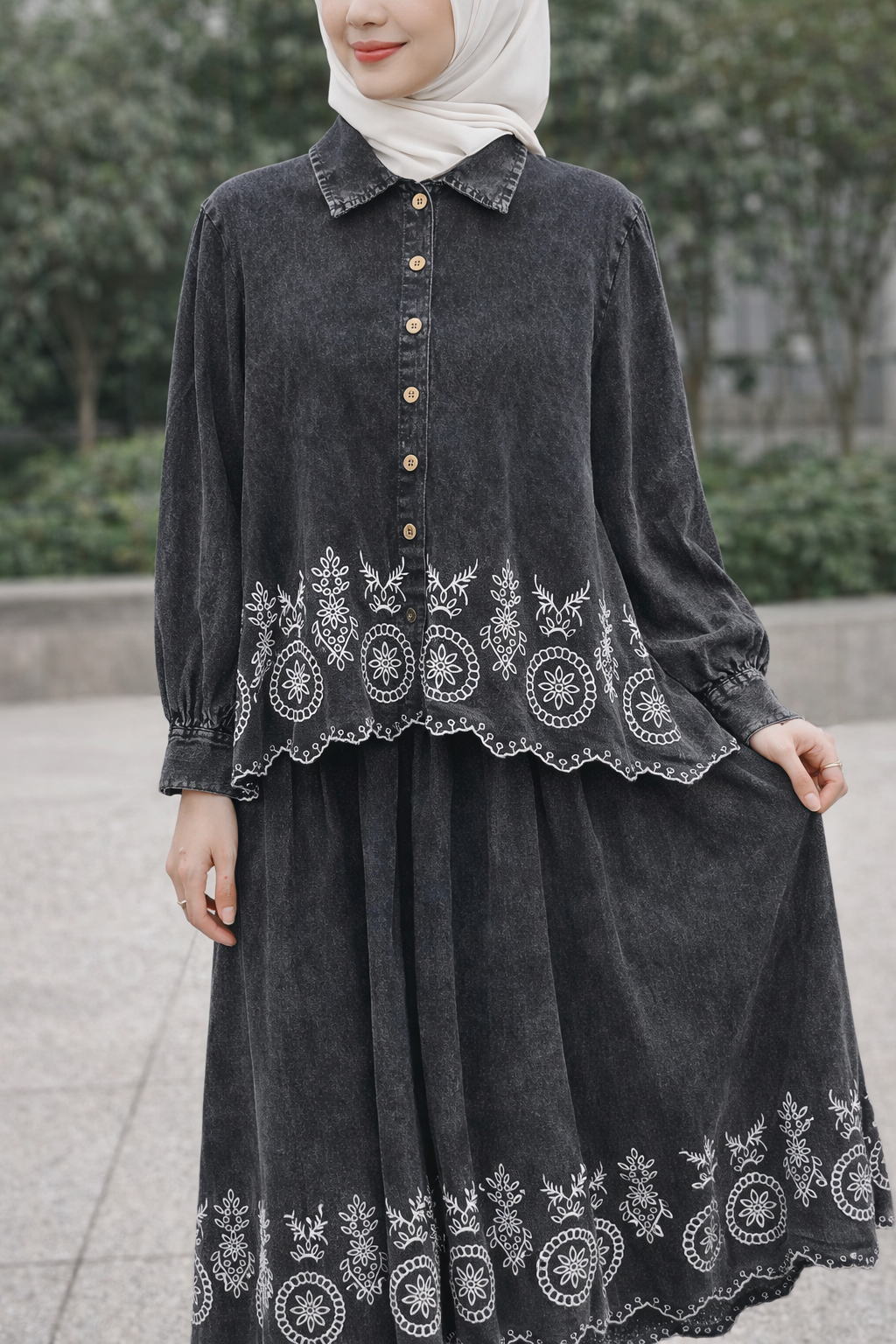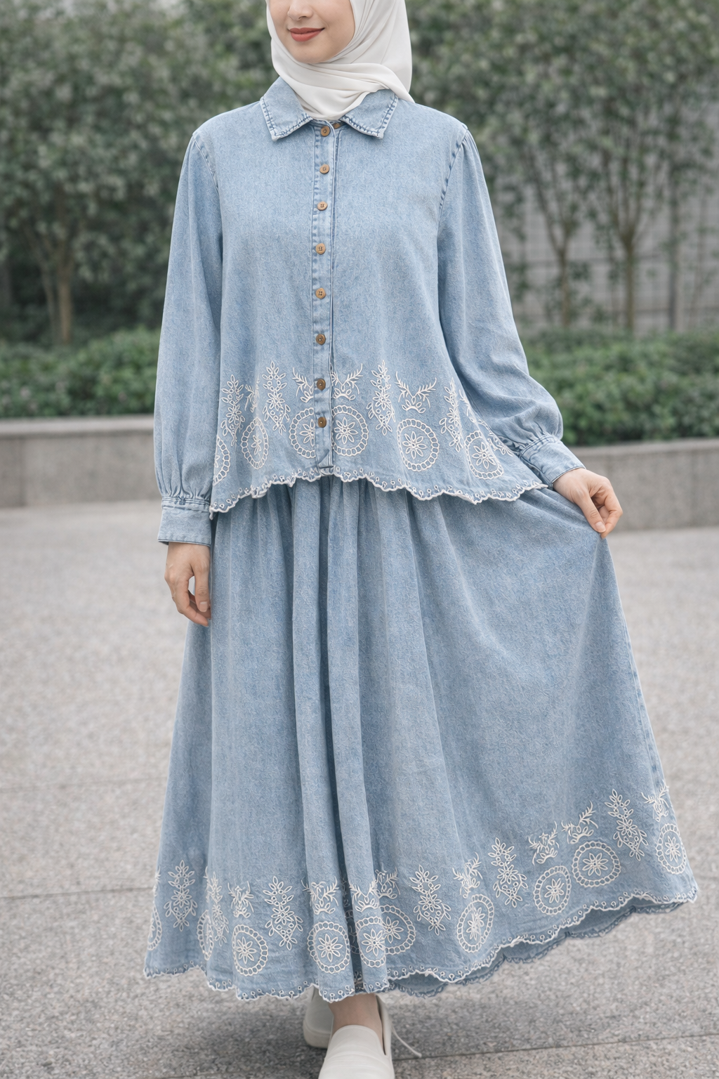 Salmah is a timeless denim ensemble designed with delicate embroidered detailing for an elegant yet effortless look. Featuring a button-down top paired with a flowy pleated skirt, this design creates the illusion of a two-piece while remaining perfectly coordinated.