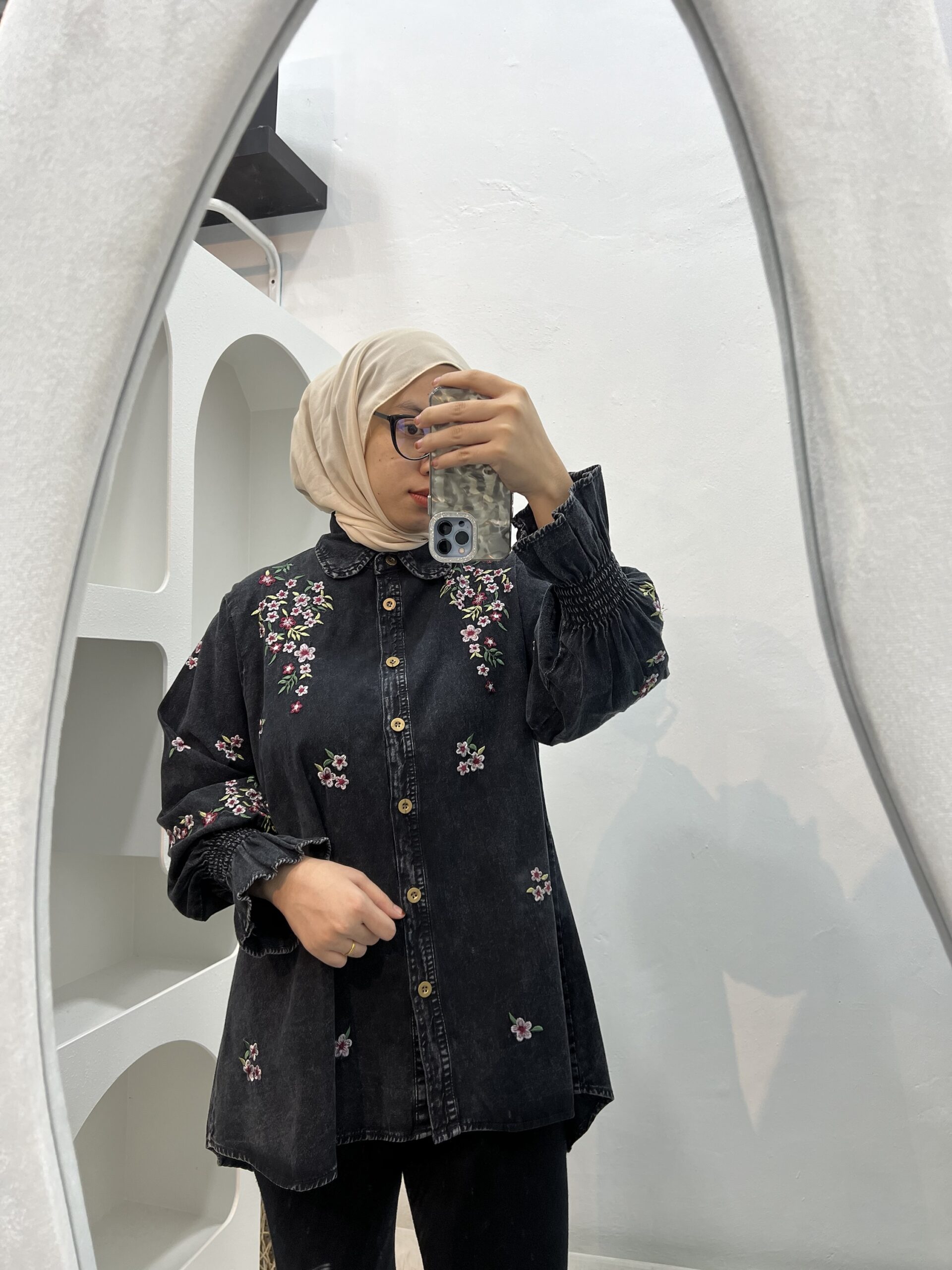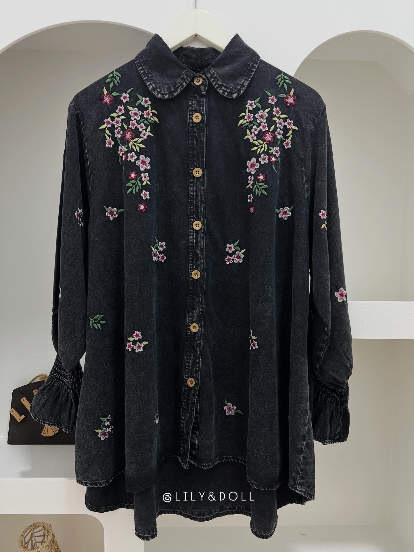 The Tiara Denim Embroidery Blouse combines a classic and feminine touch. Made from soft, comfortable denim, it features delicate floral embroidery on the front and sleeves, adding a subtle, elegant charm. The blouse has a classic collar and full button-down front, making it neat and versatile—perfect for both casual and semi-formal looks.