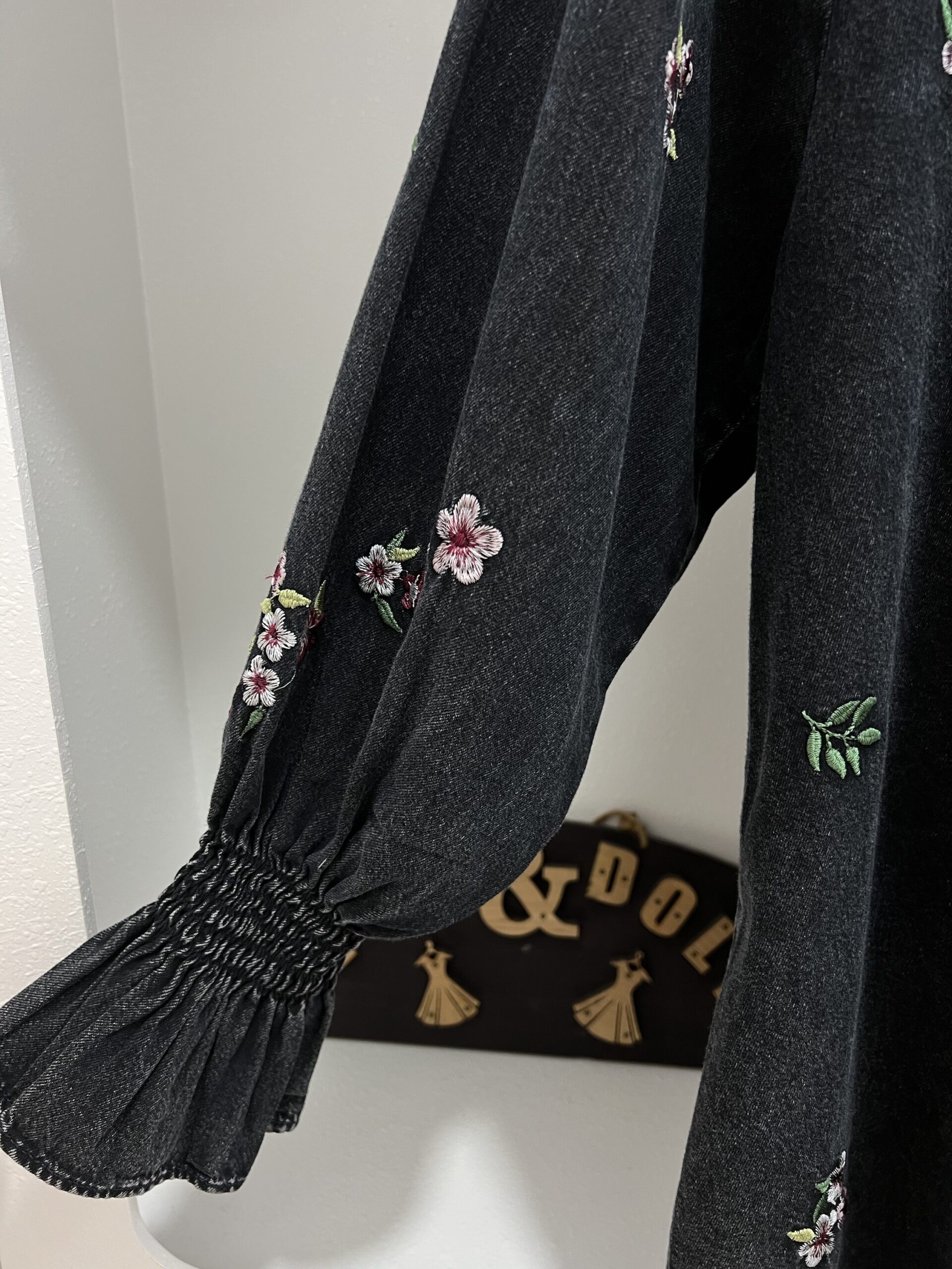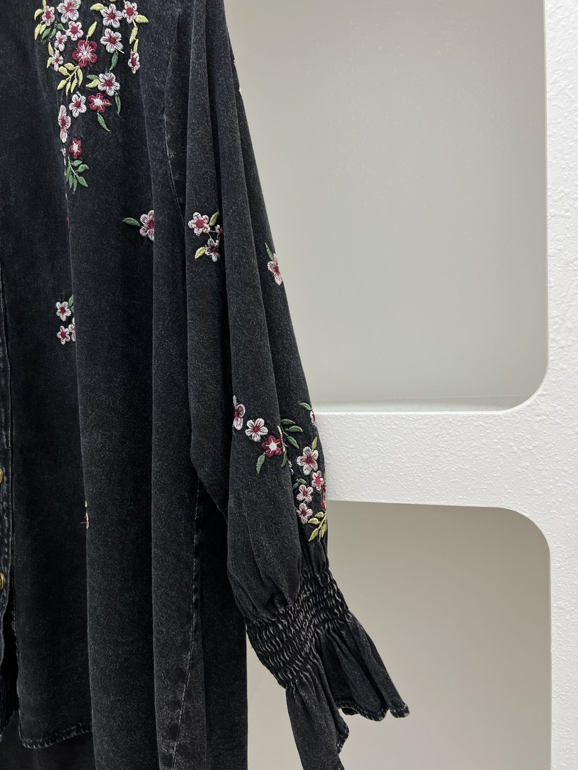 ✨ Details: Floral embroidery, smocked sleeves, front buttons