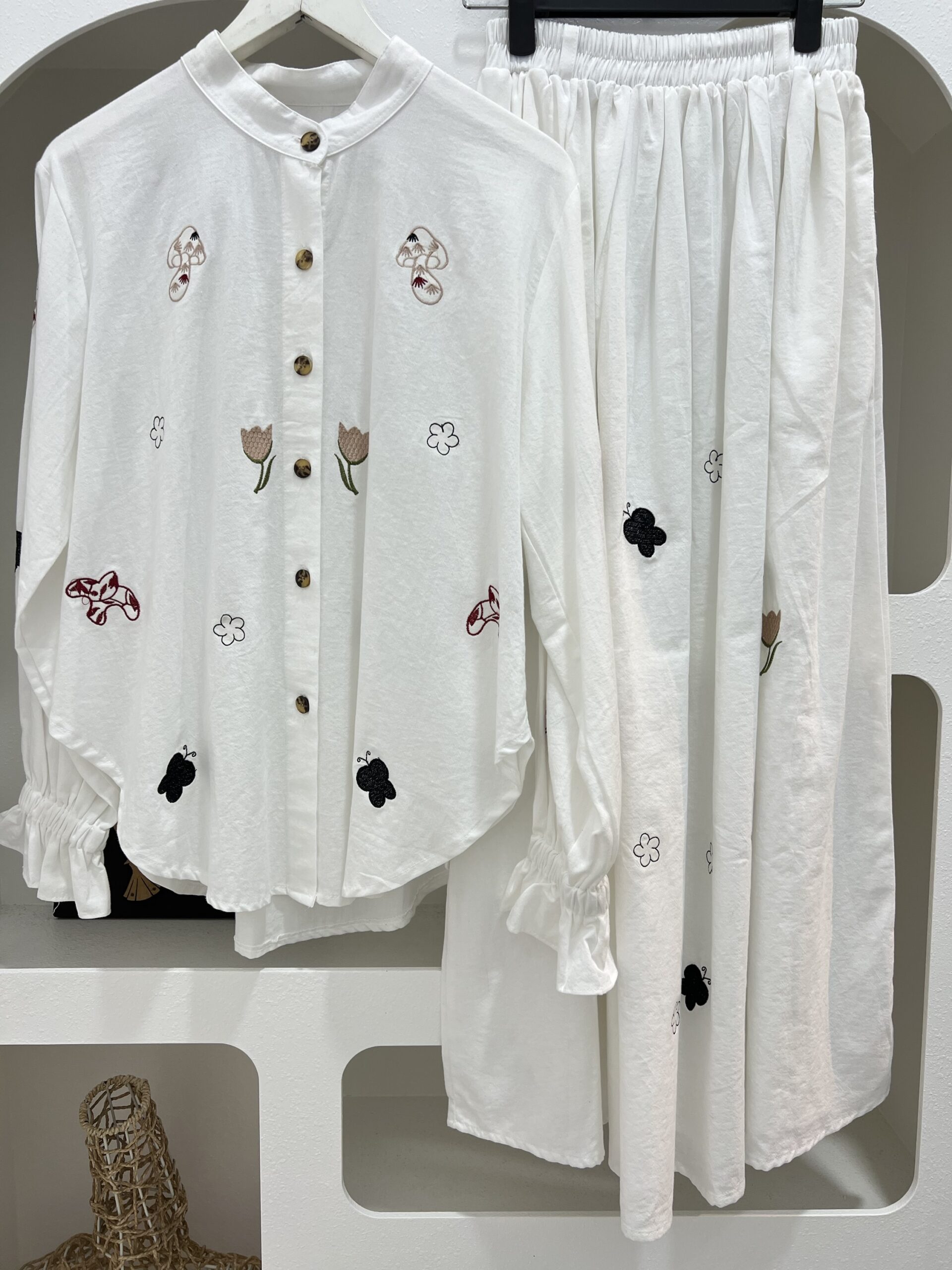 The Zahra Set is crafted from soft, breathable Tencel linen, detailed with delicate embroidery that adds a touch of sophistication to its minimalist silhouette.